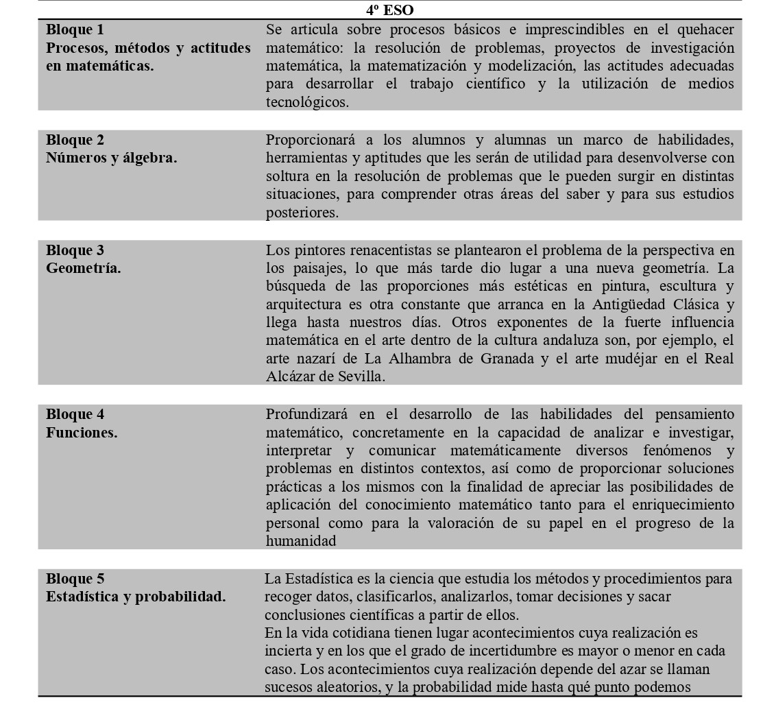 En la Orden de 14 de julio de 2016, concretamente en el Anexo I, en el que se desarrolla el currículo de matemáticas orientadas a las enseñanzas académicas, se establecen los bloques de contenidos y contenidos que se deben desarrollar para 4ºESO, incluyendo algunas referencias propias de la comunidad autónoma andaluza.